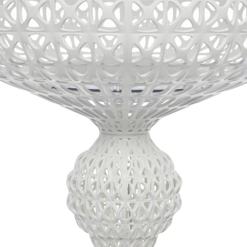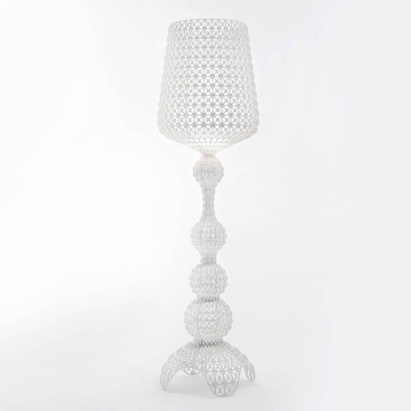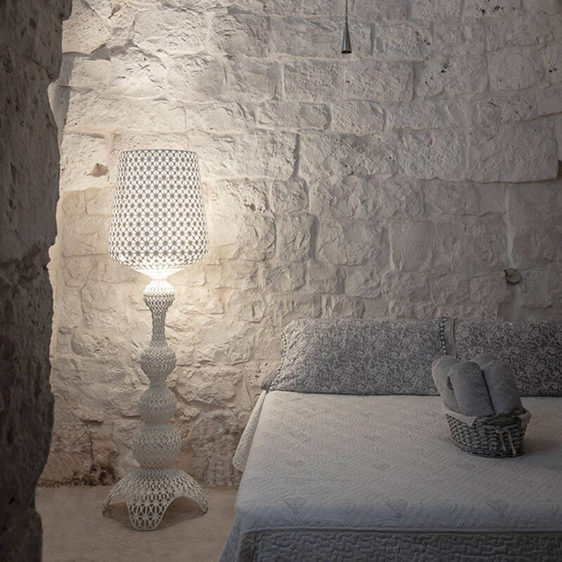 Stmievateľná dizajnová stojacia lampa LED Kabuki od spoločnosti Kartell Silueta lampy pripomína opulentné osvetľovacie prvky z obdobia baroka. LED stojacia lampa spája klasický, hravý dizajn s modernou technológiou a modernými materiálmi. Hoci štruktúra tienidla a rámu pripomína jemnú čipku, materiál v skutočnosti nie je textil, ale termoplastický technopolymér, ktorý bol vylisovaný vstrekovaním. Množstvo malých otvorov v tienidle vytvára pri zapnutí lampy atraktívny svetelný vzor. Architekt a dizajnér Ferruccio Laviani vyvinul sériu lámp Kabuki pre dizajnérsku spoločnosť Kartell so sídlom v Novigliu pri Miláne. Plast vo všetkých svojich tvaroch a farbách je základným materiálom, z ktorého sa vyrábajú dizajnérske kúsky, ktoré v posledných desaťročiach preslávili spoločnosť Kartell. Niektoré z nábytku a svietidiel Kartell sú dnes už klasikou dizajnu a možno ich nájsť v rôznych múzeách moderného umenia.