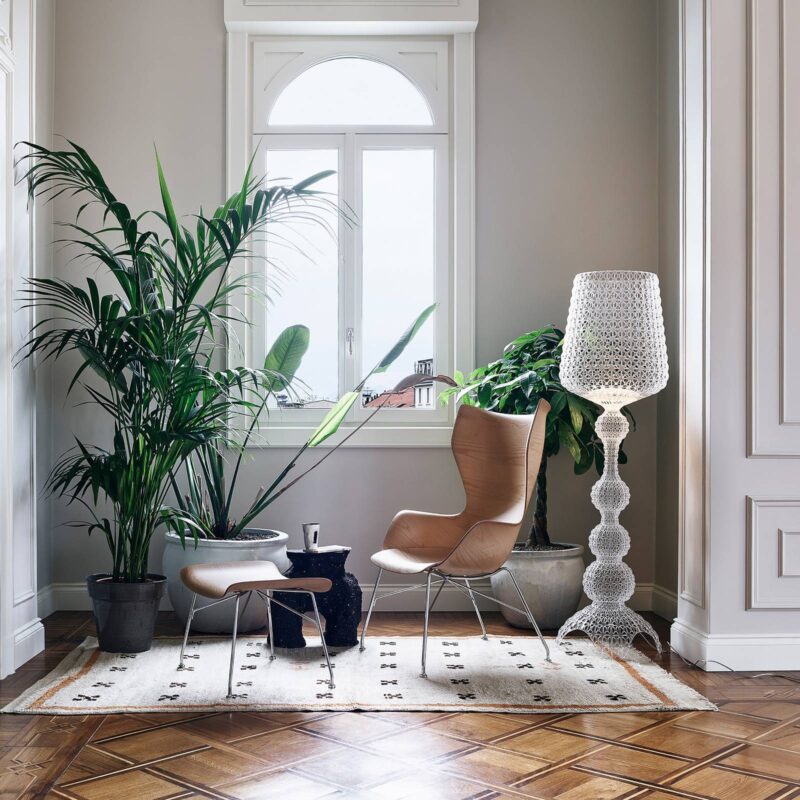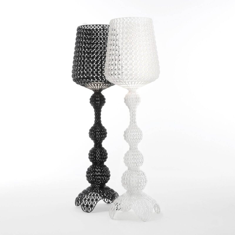 Stmievateľná dizajnová stojacia lampa LED Kabuki od spoločnosti Kartell Silueta lampy pripomína opulentné osvetľovacie prvky z obdobia baroka. LED stojacia lampa spája klasický, hravý dizajn s modernou technológiou a modernými materiálmi. Hoci štruktúra tienidla a rámu pripomína jemnú čipku, materiál v skutočnosti nie je textil, ale termoplastický technopolymér, ktorý bol vylisovaný vstrekovaním. Množstvo malých otvorov v tienidle vytvára pri zapnutí lampy atraktívny svetelný vzor. Architekt a dizajnér Ferruccio Laviani vyvinul sériu lámp Kabuki pre dizajnérsku spoločnosť Kartell so sídlom v Novigliu pri Miláne. Plast vo všetkých svojich tvaroch a farbách je základným materiálom, z ktorého sa vyrábajú dizajnérske kúsky, ktoré v posledných desaťročiach preslávili spoločnosť Kartell. Niektoré z nábytku a svietidiel Kartell sú dnes už klasikou dizajnu a možno ich nájsť v rôznych múzeách moderného umenia.
