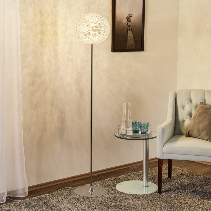 stojaca lampa Planet – oslnivé odlesky s modernou LED technológiou Japonský produktový dizajnér Tokujin Yoshioka navrhol túto veľkolepú stojaca lampa pre talianskeho výrobcu značiek Kartell . Tvar tienidlo na lampu do istej miery pripomína planétu, ktorá nie je úplne guľatá, ale skôr eliptická. Kryštalický vzhľad povrchu zaisťuje magické trblietky a trblietavé odlesky. Špeciálnym znakom je tu materiál – namiesto krištáľového skla sa tu používa špeciálna syntetická živica, takzvaný termoplastický technopolymér, ktorý vďaka svojej rozdielnej hrúbke materiálu láme svetlo v každom uhle inak. Takto bola vynikajúco dosiahnutá úloha vytvoriť efekt šumivého svetla bez použitia kryštálov. Pomocou integrovaného stmievača sa dá jas planéty regulovať podľa želania. Kartell sa môže ohliadnuť za dlhou históriou spoločnosti a je vedúcou spoločnosťou v oblasti dizajnu z Talianska. So spoločnosťou Kartell spolupracujú známi návrhári z celého sveta. Okrem osvetlenia je úspech spoločnosti založený hlavne na nábytku, interiérovom vybavení a bytových doplnkoch.
