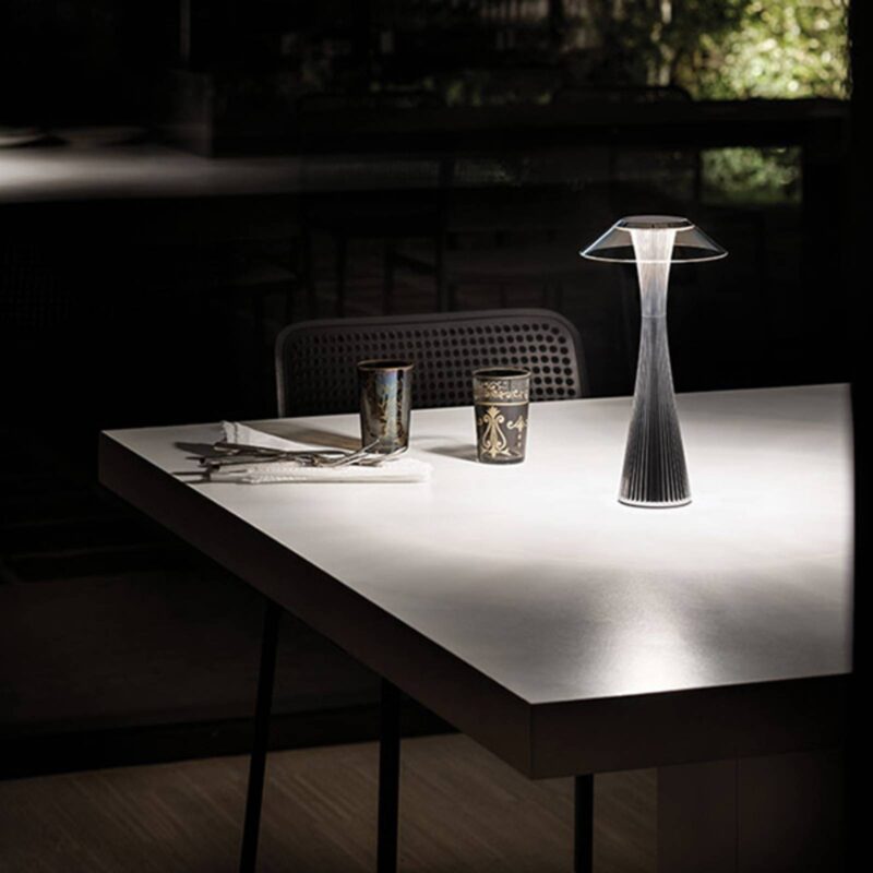 Nabíjateľná LED stolová lampa Space od Adama Tihanyho Pri vývoji stolovej lampy Space LED mal dizajnér Adam Tihany na pamäti slávnu Seattle Space Needle, vyhliadkovú vežu postavenú pre svetovú výstavu 1962. Vzhľad tejto stolovej lampy je preto veľmi futuristický a kvázi „vesmírny“. Space je nabíjateľná lampa s batériou, ktorá zaručuje maximálnu dobu horenia osem hodín. Telo a tienidlo na lampu žiarovky sú vyrobené z rôznych plastov (PMMA a ABS), niektoré sú priehľadné, niektoré nepriehľadné. Priestor sa zapína a vypína dotykom na hornú časť obrazovky. Pre dizajnérsku spoločnosť Kartell je plast vo všetkých tvaroch a farbách jedným z najbežnejšie používaných materiálov pre ich dizajnérske kúsky, z ktorých niektoré sú také slávne, že sa stali skutočnou klasikou. Medzi známe výtvory spoločnosti Kartell patria detská stolička K 1340 a lis na citrón KS 1481 alebo lampa model 4006 od Achilla a Piergiacoma Castiglioniho z roku 1959