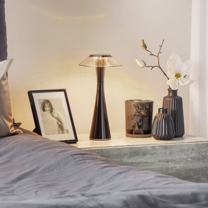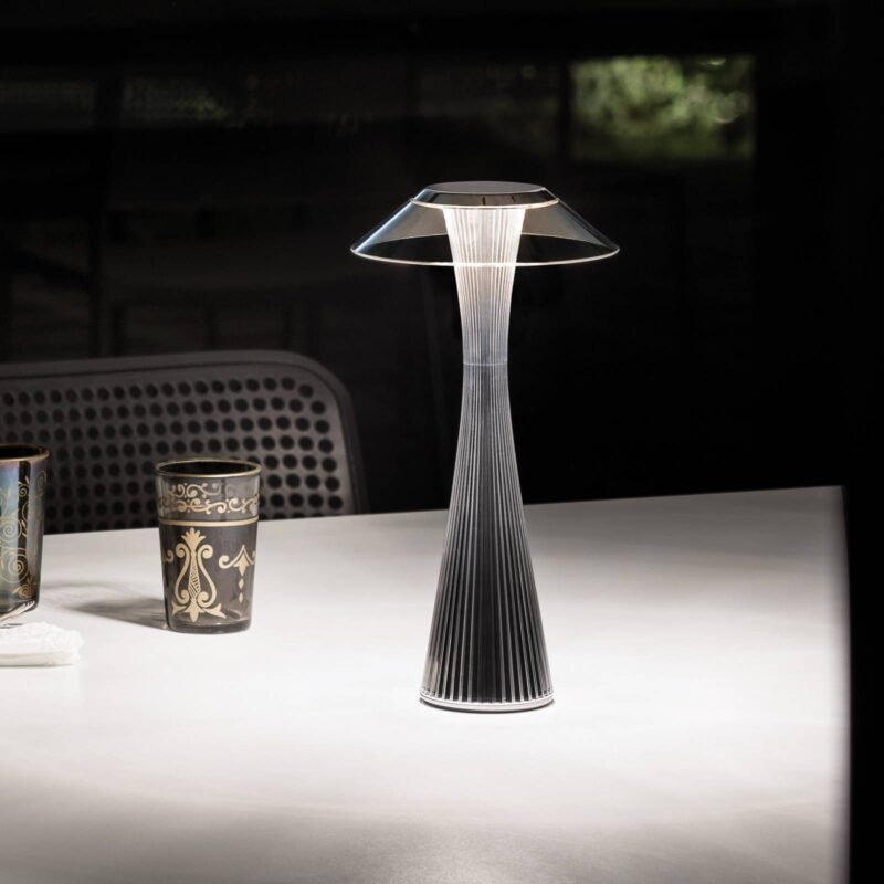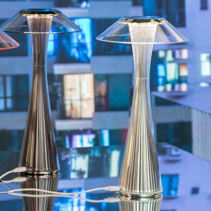 Nabíjateľná LED stolová lampa Space od Adama Tihanyho Pri vývoji stolovej lampy Space LED mal dizajnér Adam Tihany na pamäti slávnu Seattle Space Needle, vyhliadkovú vežu postavenú pre svetovú výstavu 1962. Vzhľad tejto stolovej lampy je preto veľmi futuristický a kvázi „vesmírny“. Space je nabíjateľná lampa s batériou, ktorá zaručuje maximálnu dobu horenia osem hodín. Telo a tienidlo na lampu žiarovky sú vyrobené z rôznych plastov (PMMA a ABS), niektoré sú priehľadné, niektoré nepriehľadné. Priestor sa zapína a vypína dotykom na hornú časť obrazovky. Pre dizajnérsku spoločnosť Kartell je plast vo všetkých tvaroch a farbách jedným z najbežnejšie používaných materiálov pre ich dizajnérske kúsky, z ktorých niektoré sú také slávne, že sa stali skutočnou klasikou. Medzi známe výtvory spoločnosti Kartell patria detská stolička K 1340 a lis na citrón KS 1481 alebo lampa model 4006 od Achilla a Piergiacoma Castiglioniho z roku 1959