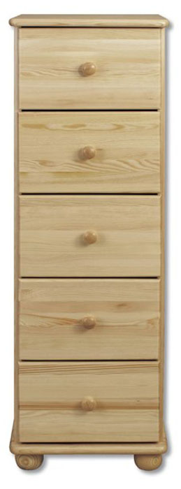 KD116 komoda s 5 zásuvkami šírky 40 cm. Farebné prevedenie – prírodná borovica. Ponúkame za príplatok možnosť namorenia na odtieň dub, orech a jelša. Nábytok Drewmax je vyrobený z kvalitného borovicového masívu. Pozor!!! Produkt má špeciálnu povrchovú úpravu na ochranu proti škodcom. Preto v prípade ak máte záujem o produkt, ktorý chcete dodatočne namoriť, treba v objednávke uviesť: požadujem produkt bez povrchovej úpravy. Dodávame v demontovanom stave.