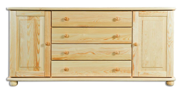 KD163 Kombinovaná komoda s 2 bočnými dvierkami a 4 zásuvkami uprostred. Celodrevená komoda z kvalitného borovicového masívu so zaoblenými hranami, guľatým úchytom a nohami. Vhodné do spálne či študentskej izby. Základné farebné prevedenie bez morenia: prírodná borovica (Dr-borovica). Možnosť namorenia na odtieň dub (Dr-dub), jelša (Dr-olcha) alebo orech (Dr-orech) za 10%-ný príplatok. Drevo je špeciálne upravené lakovaním na ochranu pred poškodením a zaručuje dlhú životnosť nábytku.