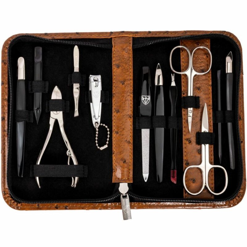 Krásna a elegantná sada na manikúru v dizajne pštrosej kože od nemeckého výrobcu Kellermann. Bohato vybavená sada 12 nástrojmi z kvalitnej poniklovanej ocele zaručí dlhoročnú životnosť a odolnosť výrobku voči opotrebeniu.Puzdro z kvalitnej syntetickej kože vo vzhľade pštrosej kože má zapínanie na zips. Vo nútri podšité zamatom, ktorý je veľmi príjemný a hebký na dotyk. Ideálny pomocník pre dokonalú domácu starostlivosť o vaše nechty. Hodnotný darček, ktorý poteší.Sada obsahuje: