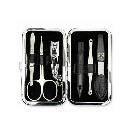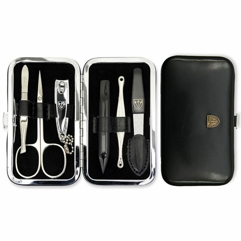 Praktická sada na manikúru zo syntetickej kože od nemeckého výrobcu Kellermann. Nástroje sú vyrobené z kvalitnej poniklovanej ocele a zaručia dlhoročnú životnosť a odolnosť výrobku voči opotrebeniu. Puzdro je opatrené klipovým uzáverom, je pevné, ľahko sa otvára. Vo vnútri puzdro podšité zamatom, ktorý je veľmi príjemný na dotyk.Každodenný pomocník pre dokonalú domácu starostlivosť o vaše nechty. Praktická veľkosť, hodí sa na cesty, zmestí sa do každej kabelky či tašky.Sada obsahuje: