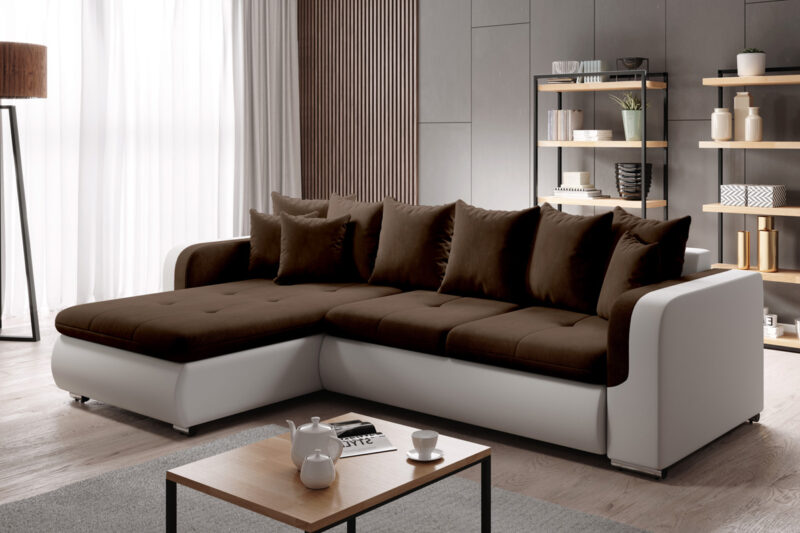 KENY MINI je dizajnová a štýlová rohová sedacia súprava, ktorá sa bude vynímať v moderných a priestranných interiéroch.Sedák je tvorený kvalitnou vlnovcovou pružinou v kombinácii s pohodlnou PUR penou o hustote T-30. Sedačka je čalúnená ekokožou MADRYT 120 a kvalitnou poťahovou látkou Sun 29. Nožičky sú vyrobené z kovu, pochrómované.Súčasťou sedačky sú tri okrasné vankúšiky.Sedačka je rozkladacia. Rozložíte ju pomocou automatu typu DELFIN. Poskytne vám spaciu plochu: 217 x 134 cm. Rozmery sedačky (š,v,h): 267 x 76 x 162 cm. Výška sedačky bez vankúšov: 67 cm. Hĺbka sedacej časti: 48 cm. Výška sedenia: 42 cm. Výška nožičiek: 5 cm.Sedačka je v ľavom prevedení rohu. V ponuke nájdete rohovú sedačku KENY MINI aj v pravom prevedení rohu.Dodávame v demontovanom stave.