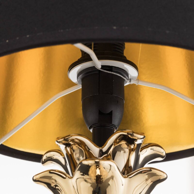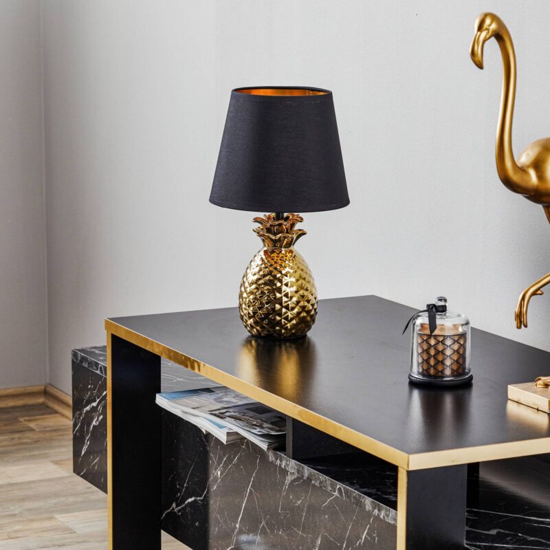 Keramická stolová lampa Ananás v zlatej a čiernej farbeTáto keramická stolová lampa s príznačným názvom Ananás má zlatý podstavec v tvare ananásu a je doplnená okrúhlym tienidlom, ktorého zvláštnym detailom je čierna a zlatá farba. Originálny dizajn stolnej lampy z nej robí mimoriadny pútač pozornosti v každej miestnosti, ktorý možno harmonicky zakomponovať do najrôznejších štýlov interiéru.okrúhle textilné tienidlo stolnej lampy je zvonka úplne čierne a zvnútra prekvapí zlatým sfarbením. Tento výrazný farebný koncept dodáva lampe nádherne teplé, príjemné svetlo. Zlatý podstavec v tvare ananásu je mimoriadne pútavý a robí z lampy nádherne tvarovaný dekoratívny prvok, ktorý vyniká svojou extravaganciou.