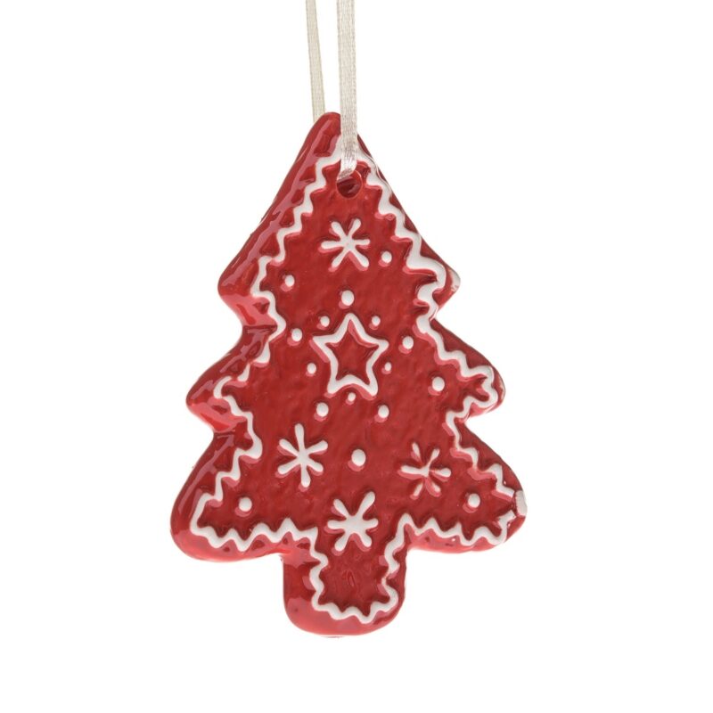 Závesný červený stromček s dekorom medovníkov vytvorí rozprávkovú vianočnú atmosféru. Dekorácia je vyrobená z keramiky s červenou lesklou glazúrou a ozdobená jemným medovníkovým vzorom. Vďaka praktickému závesu ho ľahko zavesíte na stromček, do okna alebo na iné vybrané miesta vo vašom domove.