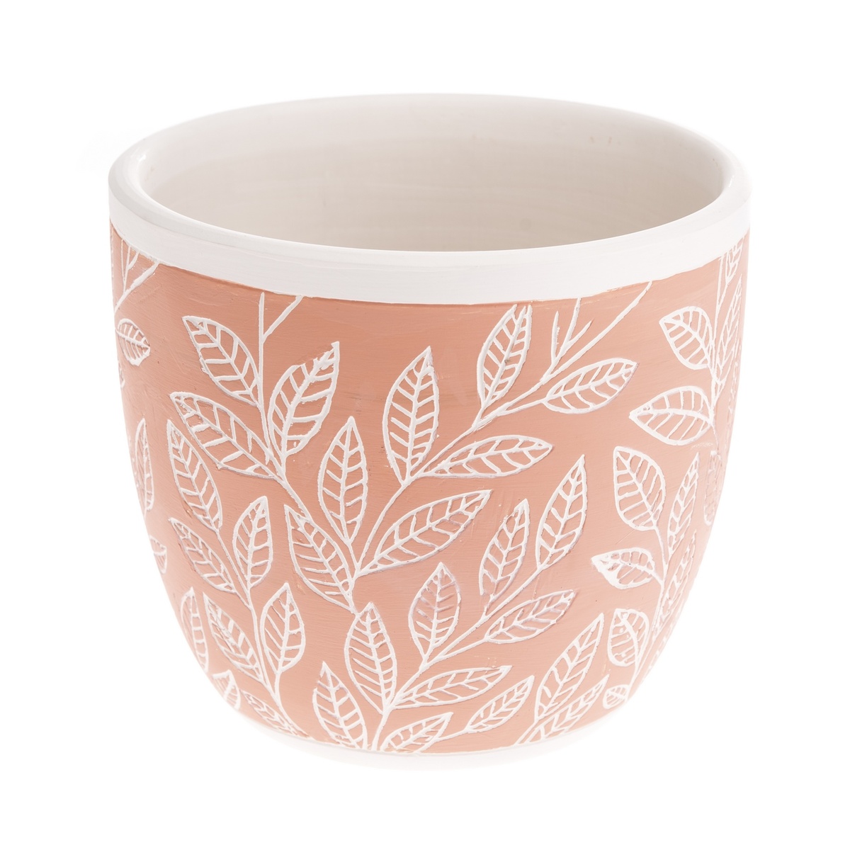 Kvetináč z keramiky v oranžovej farbe s bielym podkladom a okrajom krytu, zdobený jednotným motívom vetvičiek a listov, je ideálnym variantom pre izbové aj vonkajšie rastliny. Dekoračný vzor je prevedený ako ryty do steny kvetináča k podkladovej farbe. Jednoduchá, takmer minimalistická forma s organickým charakterom zdobenia bude príjemným kontrastom doplňujúcim kvety.Tento veľmi originálny kryt vnesie mnoho šarmu do každého interiéru alebo záhrady.