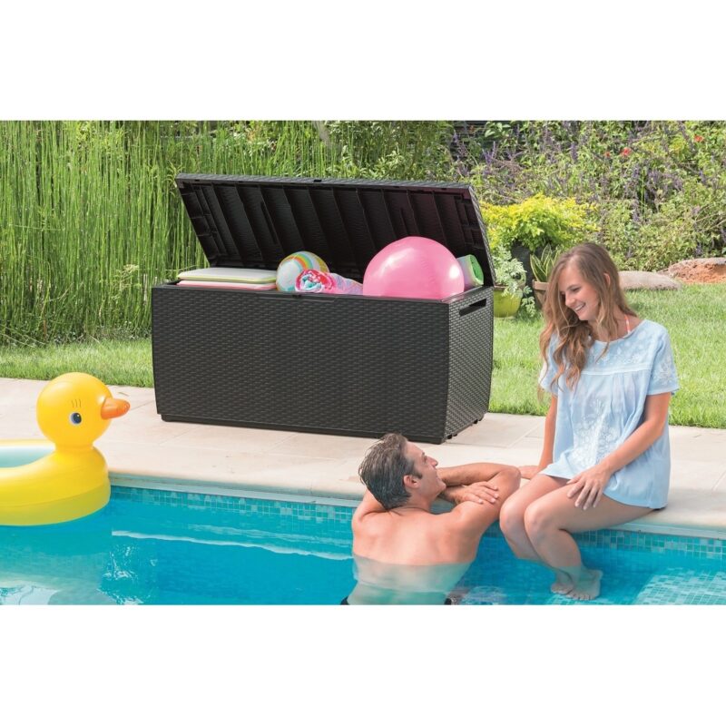 Praktický úložný box nájde uplatnenie na balkóne aj v záhrade. Je vyrobený z robustného, veľmi kvalitného plastu, ktorý je odolný voči počasiu. Hodí sa na uschovanie záhradných potrieb alebo hračiek v záhrade.