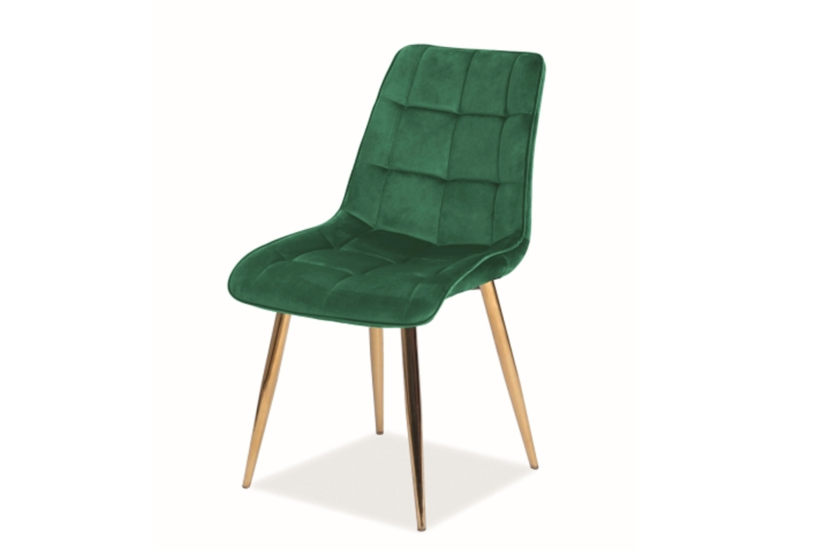 KIK je moderná stolička, vhodná do jedálne aj kuchyne. Svoje miesto si však nájde aj v reštaurácii či kafetérii. Dizajn stoličky zvýrazňuje jej zamatové prevedenie a efektné prešitie čalúnených častí. Pre pohodlné sedenie má stolička čalúnený sedák aj opierku. Konštrukcia stoličky je kovová, v zlatej farbe. Sedacia a opierková časť je čalúnená kvalitnou zamatovou látkou BLUVEL 78 v zelenom farebnom odtieni. Rozmery stoličky: Celková výška stoličky: 89 cm Výška sedáku: 49 cm Hĺbka: 44 cm Šírka: 51 cm Dodávané v demonte. Stolička je dostupná aj v ďalších farbách.