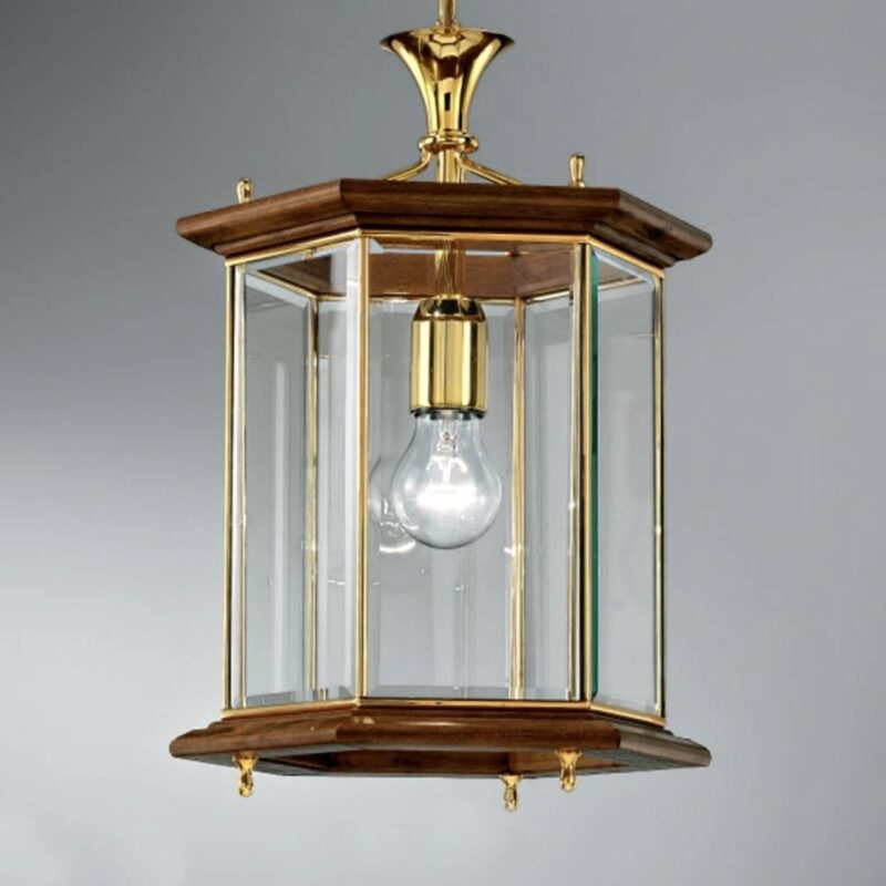 Závesná lampa Mona v atraktívnom dizajneTalianske remeselné spracovanie sa prejavuje v peknej závesnej lampe Mona. Drží ju kovová retiazka a štýlovo kombinuje materiály drevo, sklo a kov. Šesťuholníkový rám s priehľadnými sklami otvára pohľad na žiarovku vo vnútri, ktorú drží zlatá objímka. Ďalšie zlaté a dodatočne drevené prvky robia zo svietidla Mona jedinečné svietidlo, ktorým je. Taliansky výrobca spája tradičné, benátske remeslo s dnešnými modernými požiadavkami. Vysoká kvalita a dôraz na detail sú dôležitými prvkami tohto dlhoročného umenia osvetlenia. Takto vznikajú stále znovu a znovu výnimočné a výnimočné kúsky, ktoré podčiarkujú jedinečnosť každého obytného priestoru.