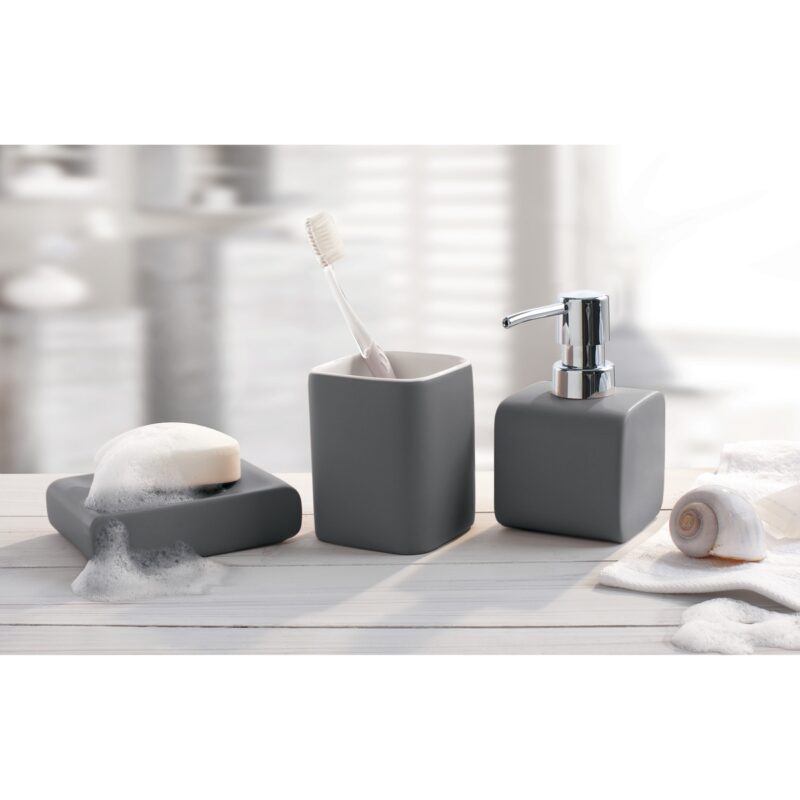 Dávkovač mydla Cubic v modernom dizajne. Vhodné vybavenia každej kúpeľne. K dispozícii v rovnakom dizajne aj kelímok na zubnú kefku, dávkovač mydla a WC set.