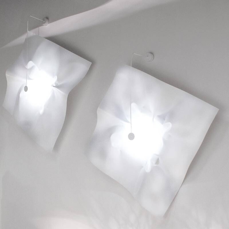 Biele nástenné svietidlo Crash LED s nepriamym svetlomTelo nástenného svietidla Crash LED vyzerá ako vreckovka, ktorá bola zľahka pokrčená a nedbalo odhodená, čím zodpovedá svojmu názvu. Biele lakované oceľové telo bolo vyrobené ručne a na niektorých miestach starostlivo premiečané a ohnuté. Tieto záhyby a preliačiny sú v konečnom dôsledku zodpovedné za skvelý svetelný efekt svietidla, pretože svetelný zdroj – LED dióda umiestnená v držiaku – osvetľuje telo, a tak nepriamo vyžaruje svetlo do miestnosti. Špeciálnu úlohu tu zohráva biely rozdrvený povrch nástenného svietidla. Svetlo sa vďaka bielej farbe veľmi dobre odráža do miestnosti a vrásky a preliačiny si prídu na svoje obzvlášť dobre. Vyrobené ručne.