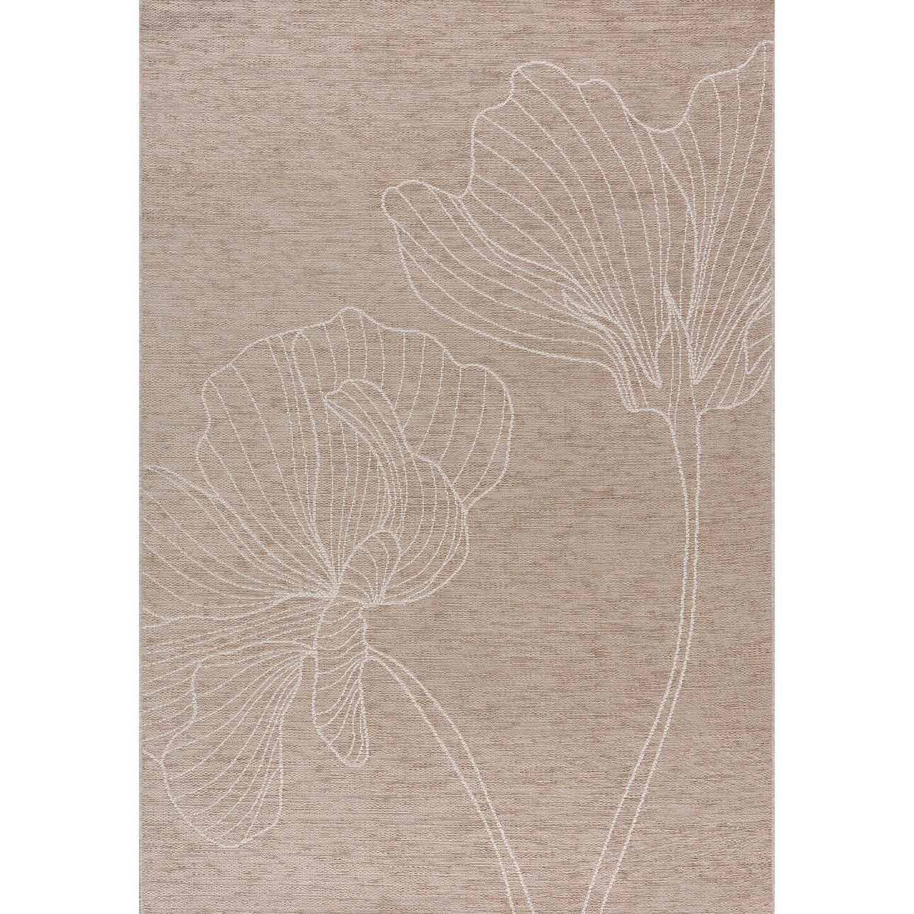Koberec s výrazným vzorom v pieskovej farbe.