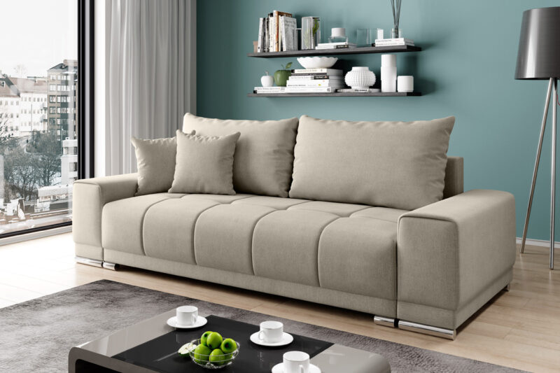 Elegantný trojsedák KOCHAB je navrhnutá v modernom duchu. Vďaka využitiu najžiadanejších prvkov sa stane ozdobou Vášho interiéru. Zaujme Vás štýlové prešívanie sedacej časti ako aj efektné opierkové a dekoračné vankúšiky. Celkové prevedenie dotvárajú lesklé nožičky valcového tvaru. Sedačka je vyrobená v kombinácii vlnovcovej pružiny a PUR peny s pevnosťou T30, ktorá zaručí pohodlné sedenie pri chvíľach relaxu. Ponúka praktický úložný priestor, ktorý oceníte v každej domácnosti. Jej neoddeliteľnou súčasťou je funkcia rozkladu, ktorá využíva mechanizmus MOSS. S jeho využitím dokážete jednoduchým spôsobom vytvoriť ložnú plochu 148 x 196 cm, vhodnú na príležitostné spanie. Sedačka je čalúnená kvalitnou látkou. Prevedenie Alfa 03.Rozmery (š/v/h): 255 x 98 x 105 cm. Výška bez vankúšov 74 cm, hĺba sedáku 58 cm, výška sedáku 40 cm. Nožičky majú výšku 5,5 cm. Dodávame v demonte. V našej ponuke nájdete aj ďalšie farebné prevedenia tohto trojsedáku ako aj rohovú sedačku KOCHAB.