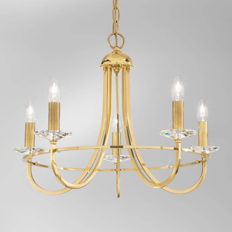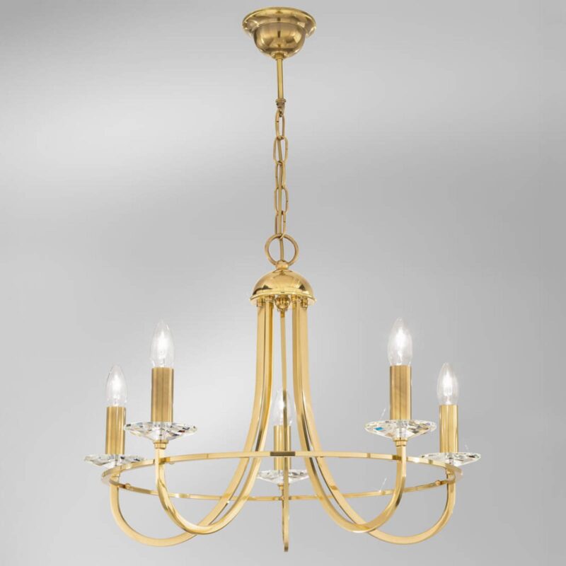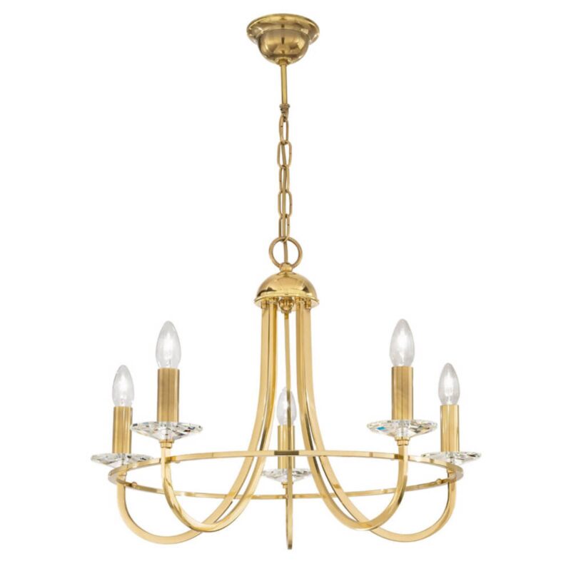 Luster s piatimi svetlami Imperial – mosadzný lesk a krištáľové sklo Elegantný kovový rám lustra Imperial s dokonalým zavesením šíri svojou povrchovou úpravou krásu anglickej mosadze. Päť ramien pre svietidlá sa ohýbajú v dôstojnej línii najskôr nadol a následne sa v elegantnom oblúku stáčajú opäť nahor. Nesú násady na žiarovky v tvare historických sviečok so štylizovanou voskovou ochranou z brúseného a trblietajúceho sa krištáľového skla. Maximálny efekt sa u tohto visiaceho lustra dosiahne použitím sviečkových žiaroviek v priehľadnom, čírom skle. Podčiarknu trblietavý efekt prvkov z krištáľového skla. Jemný kovový krúžok spája ramená svietidla ako decentný ozdobný prvok, a tým tvarovaný prvok starožitných sviečkových žiaroviek opäť siaha po kruhovom tvare. Visiaci luster Imperial doplní každý kvalitný interiér bytu atmosférou starožitnosti, a rovnako dostane verejné priestory alebo gastronómiu na vyššiu úroveň skvelým hodnotným dizajnom. Produkt európskej kvality.
