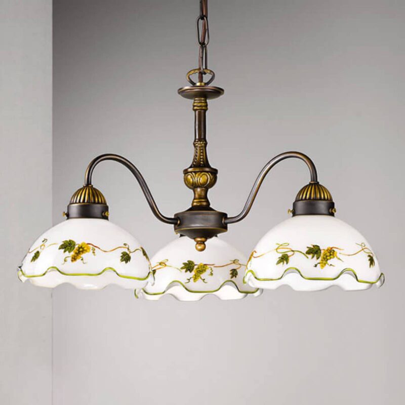 Tvarované závesné svietidlo Nonna – ručne maľované Dôstojné závesné svetlo Nonna zaujme perfektne tvarovaným kovovým rámom v starožitnom mosadznom vzhľade. Rám bol kombinovaný s ručne maľovanými, bielymi sklenenými odtieňmi, ktoré majú zelené akcenty. Riasené okraje dodávajú závesnému svietidlu Nonna rustikálny vzhľad. Vďaka štruktúre troch žiaroviek môže byť Nonna harmonicky integrovaná do obývacej izby alebo jedálne, vyžaruje rustikálny nádych a zaisťuje vhodné všeobecné osvetlenie. Podľa vašich požiadaviek môže byť Nonna zavesená medzi 50 a 95 cm. Koniec koncov, svietidlo bolo vyrobené ručne v EÚ a je možné ho prevádzkovať pomocou LED diód a energeticky úsporných žiaroviek.