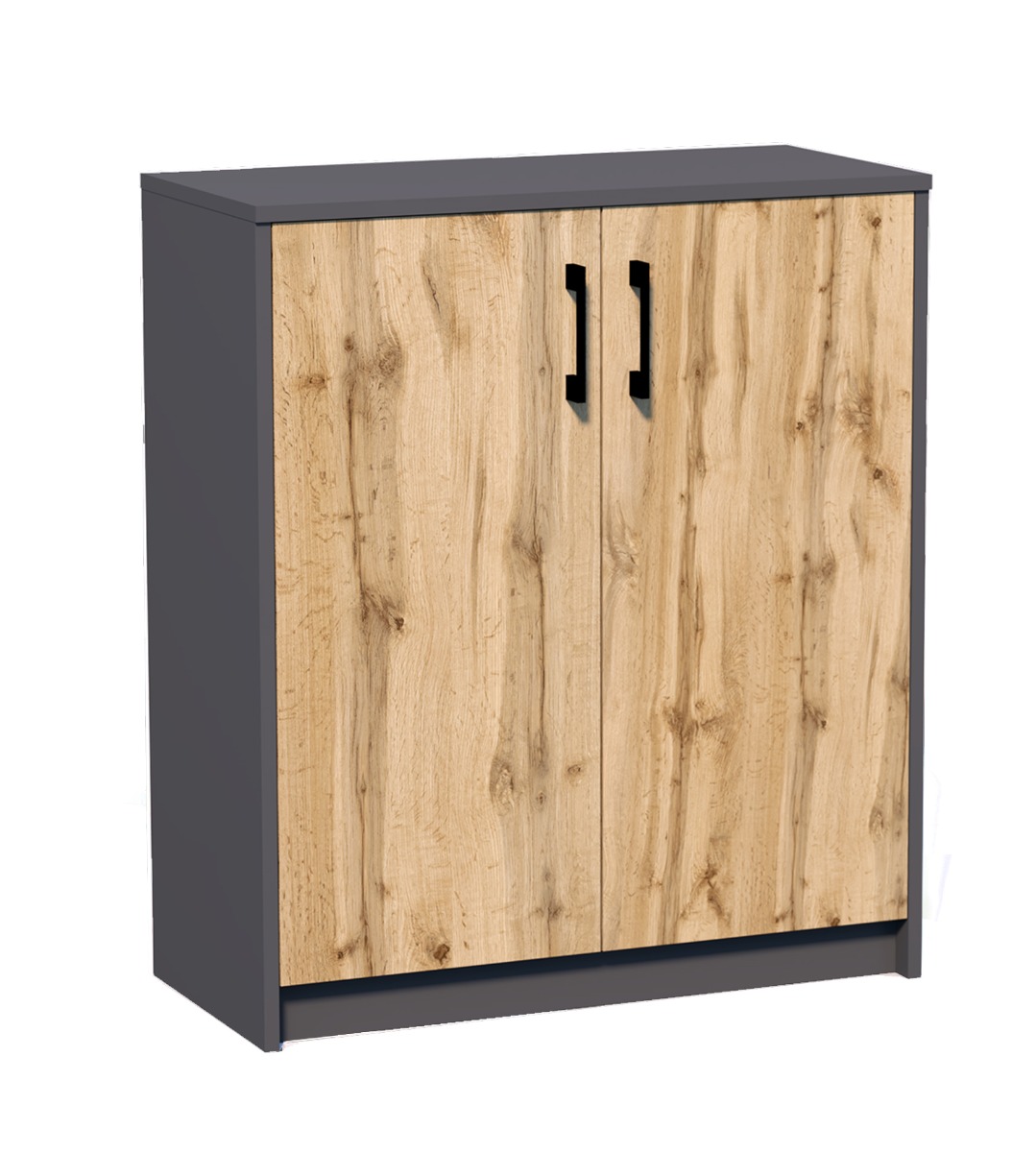 Dvojdverová komoda s vnútornou policou, je vyrobená z kvalitnej LTD dosky.Hrúbka materiálu 16 mm. Korpus skrinky je vo farbe grafit, dvierka sú v obľúbenom farebnom prevedení dub Wotan.K dispozícií máte ďalšie prevedenia na výber.Úchytky sú z plastu vo farbe alumínium oblého tvaru.Rozmery: V85/Š74/H35 cmDodávame v demontovanom stave.