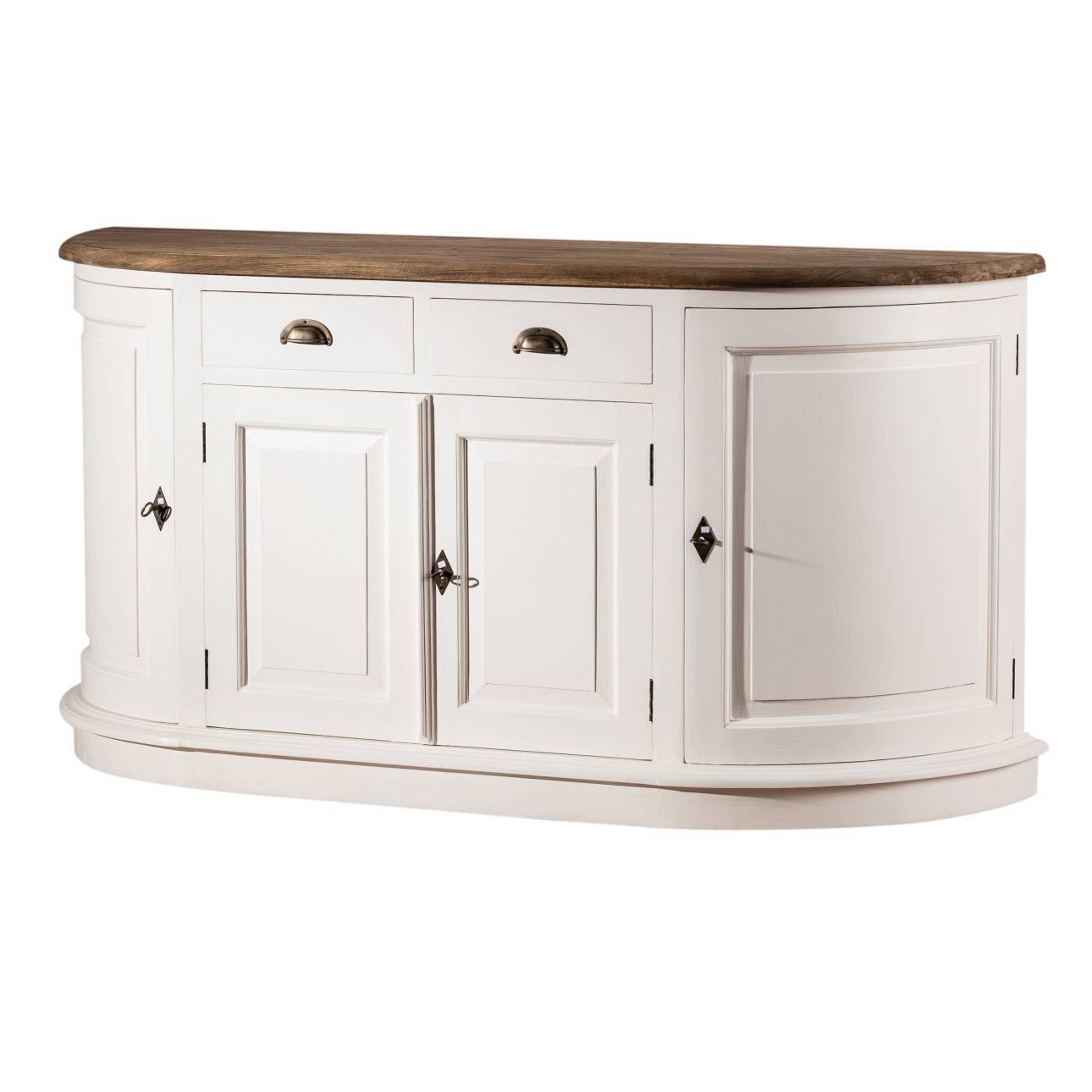 Drevená komoda so zaoblenými bokmi je praktickým a štýlovým nábytkom. Je ideálna do obývačky, spálne či jedálenskej miestnosti.Obsahuje 4 dvierok uzamykateľných na kľúčik a dve zásuvky s kovaním.Kolekcia Brighton je sériou krásneho, pevného, ručne robeného nábytku a vyrobeného z teakového dreva natretého nabielo. Dizajn, spôsob výroby a náteru nadväzuje na klasický anglický nábytok štylizovaný do retro štýlu. Interiéry zariadené nábytkom Brighton sú hrejivé a útulné. Hodia sa tiež k rôznym štýlom – do interiérov zariadených v anglickom, škandinávskom, klasickom a rustikálnom štýle.Rozmery: šírka 170 cm, hĺbka 52 cm, výška 87 cm.Materiál: masívne teakové drevo. Kovanie: kov/štylizované.Farba: biela/prirodzená