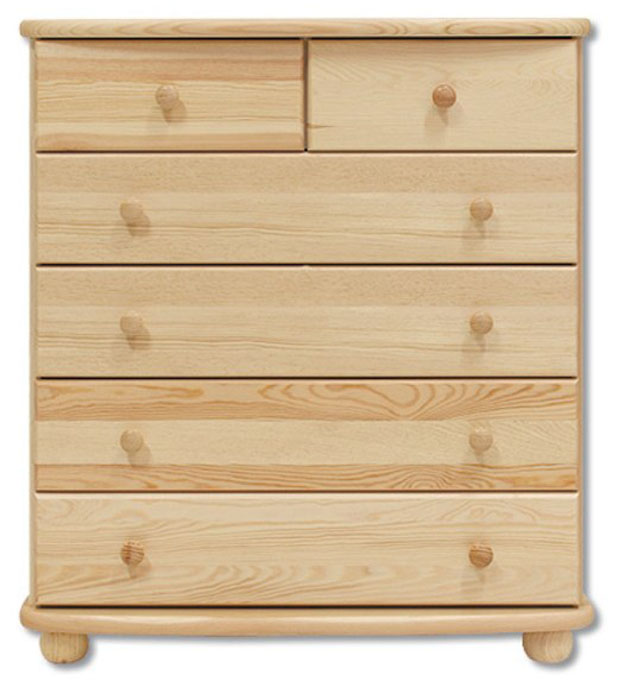 Komoda KD154 – 6 zásuviek. Farebné prevedenie – prírodná borovica. Možnosť namorenia na odtieň dub, orech a jelša za príplatok. Nábytok Drewmax je vyrobený z kvalitného borovicového masívu. Pozor!!! Produkt má špeciálnu povrchovú úpravu na ochranu proti škodcom. Preto v prípade ak máte záujem o produkt, ktorý chcete dodatočne namoriť, treba v objednávke uviesť: požadujem produkt bez povrchovej úpravy.