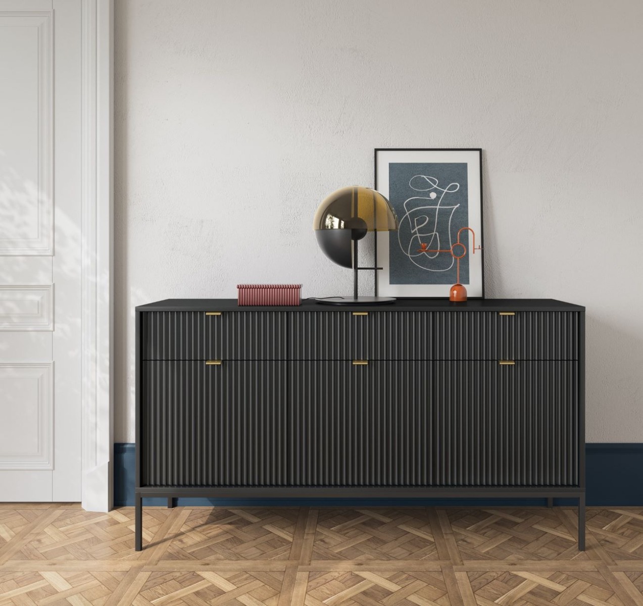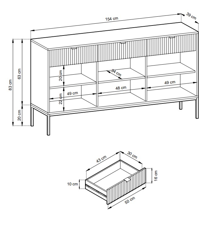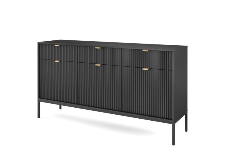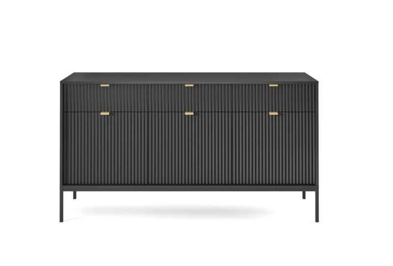 Dizajnový sektor NEW dodá Vašej obývacej miestnosti štýl. Pri sektore NEW sú použité najnovšie trendy v dizajne nábytku a kvalitný materiál. Korpus je vyrobený z 16mm LTD odolnej voči poškriabaniu, na dvierkach je použitá 18mm MDF riflovaná doska a úchyty sú hliníkové v zlatom farebnom prevedení. Všetky hrany sektoru NEW sú chránené ABS páskou.Komoda NEW KSZ154 má troje dvierka za ktorými si praktické police, kde si môžete uložiť všetky svoje potrebné dokumenty a tri zásuvky. Materiál: 16mm LTD, ABS hrany, hliníkové zlaté úchyty, 18mm MDF riflovaná doska na dvierkachRozmer (ŠxVxH) : 154 x 83 x 39 cmVýška nožičiek: 20 cm Farebné prevedenie : čiernaDodávame v demonte.