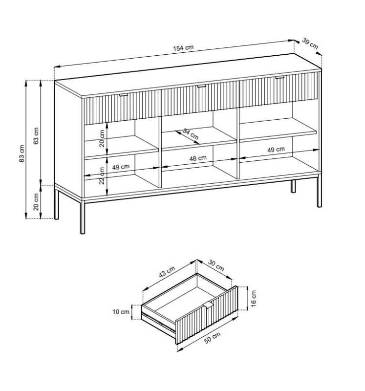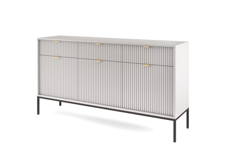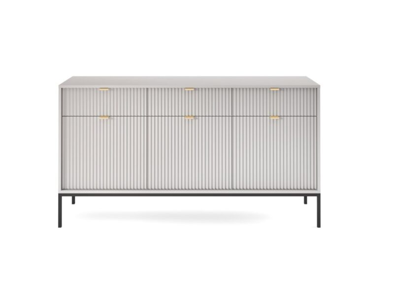 Dizajnový sektor NEW dodá Vašej obývacej miestnosti štýl. Pri sektore NEW sú použité najnovšie trendy v dizajne nábytku a kvalitný materiál. Korpus je vyrobený z 16mm LTD odolnej voči poškriabaniu, na dvierkach je použitá 18mm MDF riflovaná doska a úchyty sú hliníkové v zlatom farebnom prevedení. Všetky hrany sektoru NEW sú chránené ABS páskou.Komoda NEW KSZ154 má troje dvierka za ktorými si praktické police, kde si môžete uložiť všetky svoje potrebné dokumenty a tri zásuvky. Materiál: 16mm LTD, ABS hrany, hliníkové zlaté úchyty, 18mm MDF riflovaná doska na dvierkachRozmer (ŠxVxH) : 154 x 83 x 39 cmVýška nožičiek: 20 cm Farebné prevedenie : siváDodávame v demonte.