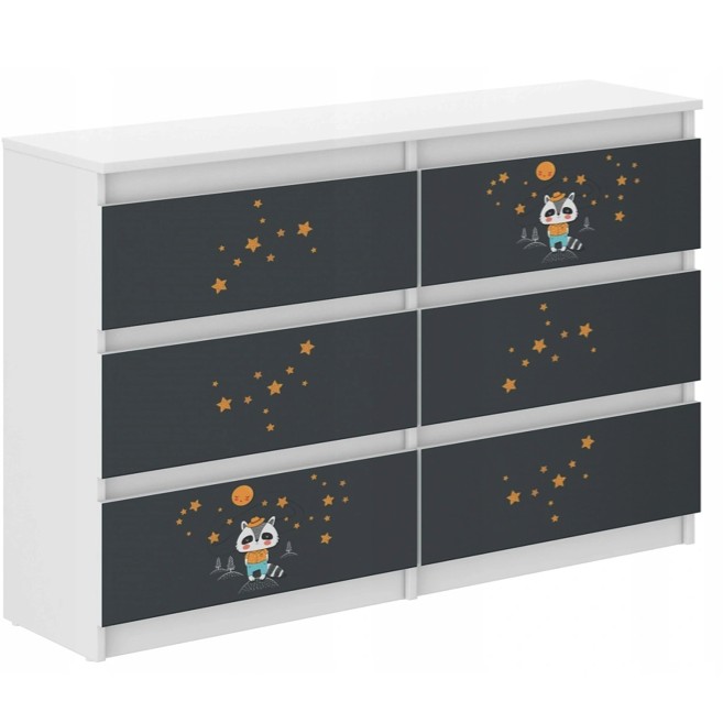 Komoda je vyrobená z bielej drevotriesky, povrchovo upravená dyhou. Zásuvky namontované na vodidlách sú vybavené zarážkami proti ich úplnému vytiahnutiu. Predná časť komody s farebnou potlačou má pekné živé farby a je zaistená špeciálnym laminátom, aby nevybledla a neopotrebovala sa. Môžete ju čistiť handričkou a vodou.