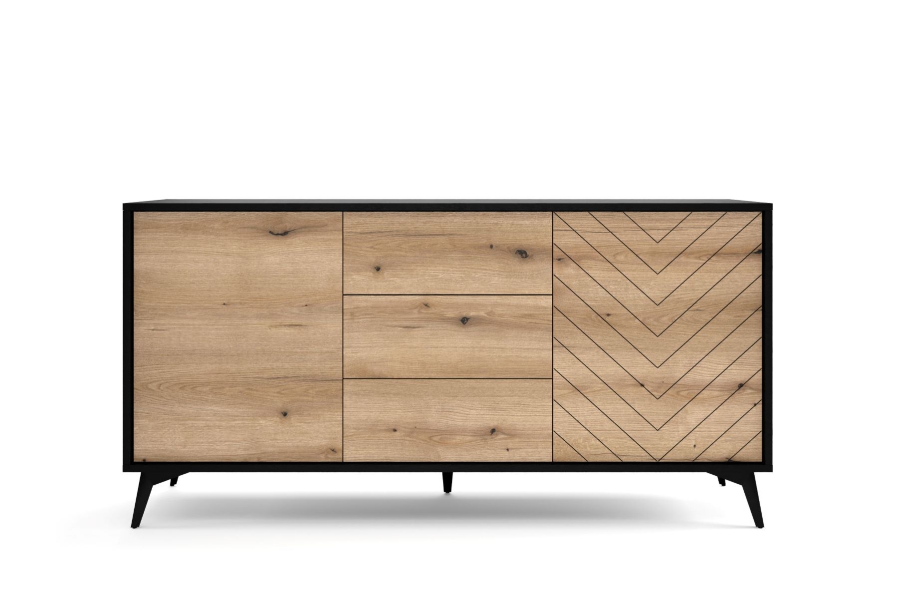 Sektor SMARAGD Vás zaujme už na prvý pohľad. Je vhodný do moderných ale i klasických interiérov no zapadne aj do interiéru, ktorý je ladený do škandinávskeho štýlu. Na prednej časti sektoru SMARAGD sa nachádza jemná vyfrézovaná dekorácia. Celý sektor má otváranie PUSH TO OPEN.Komoda SMARAGD KSZ154 má dvoje dvierka za ktorými je praktická polica a tri zásuvky.Materiál: 16mm LTD, kovové nohy, ABS hranyRozmer (ŠxVxH) : 154 x 77 x 39 cmFarebné prevedenie: dub evoke/čiernaNábytok je dodávaný v demonte.