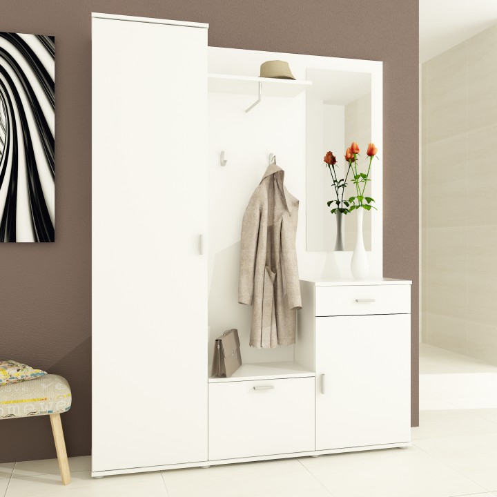 Predsieň AMALIA možno zakúpiť ako zostavu, ktorá pozostáva z: šatníková skriňa, vešiakový panel, botník, skrinka so zásuvkou a zrkadlo. Predsieň Amalia je kvalitný slovenský výrobok vyrobený z laminovanej DTD (hrúbka 1,6 cm) vo farbe biela, pričom na výber je aj v iných farebných vyhotoveniach.