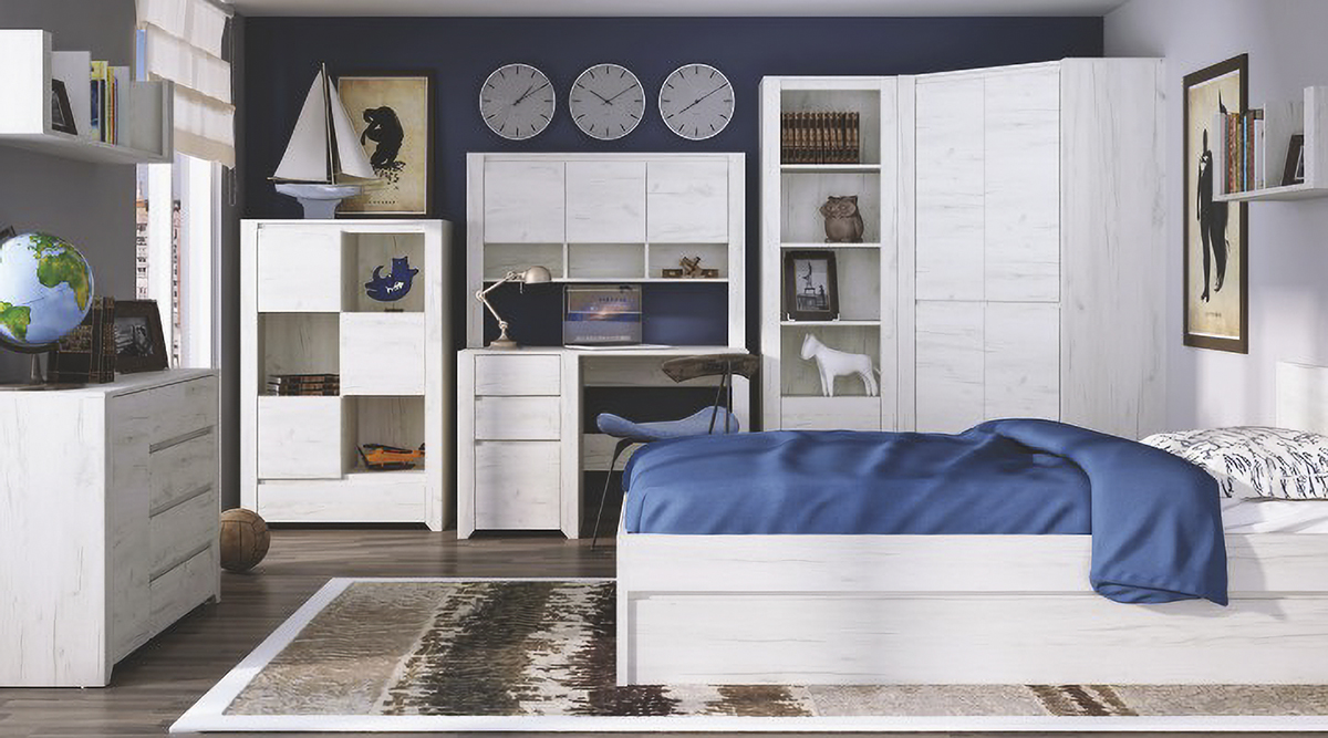 Študentskú izbu ANGEL možno zakúpiť ako zostavu, ktorá pozostáva z: jednolôžková posteľ (95,8×206,1×80,5 cm), rohová šatníková skriňa (96x96x190,5 cm), úzky regál (56×40,2×190,5 cm), menšia polica (84x25x21,6 cm), PC stôl (118,7x60x76,5 cm), nadstavba na PC stôl (118,7×25,2×83,2 cm), široký regál …