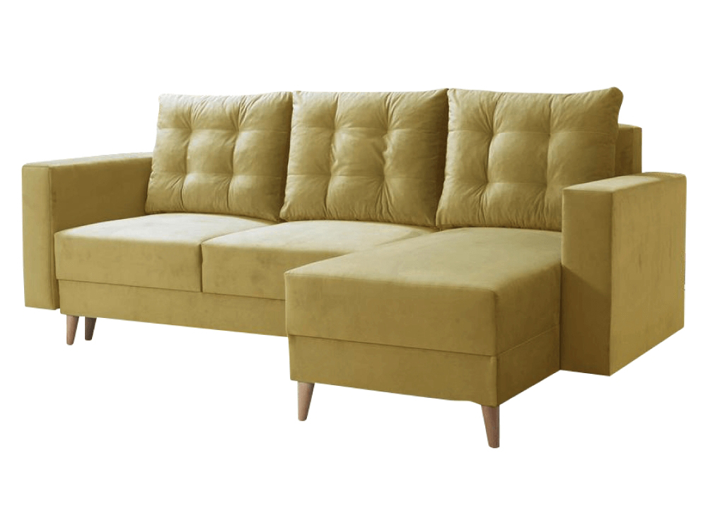Rohová sedačka s rozkladom a úložným priestorom Bleky Roh P v žltej farbe s bukovými detailmi je ideálnym riešením pre moderné interiéry. Táto elegantná sedacia súprava od značky KONDELA ponúka nielen štýlový vzhľad, ale aj praktické funkcie, ktoré ocení každá domácnosť.