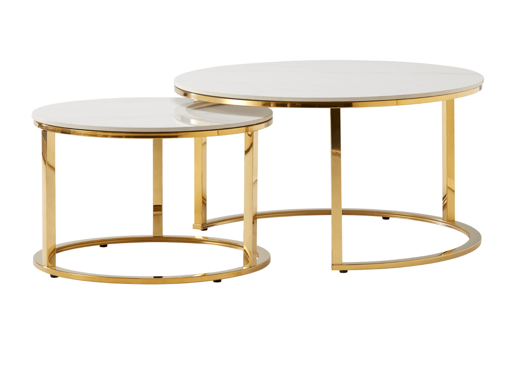 Konferenčný stolík Devnet 2 New v elegantnej kombinácii zlatej farby a svetlého mramoru je ideálnym doplnkom pre moderné interiéry. Tento set obsahuje dva okrúhle stolíky, ktoré sa dokonale hodia do obývačky alebo iných priestorov vášho domova.