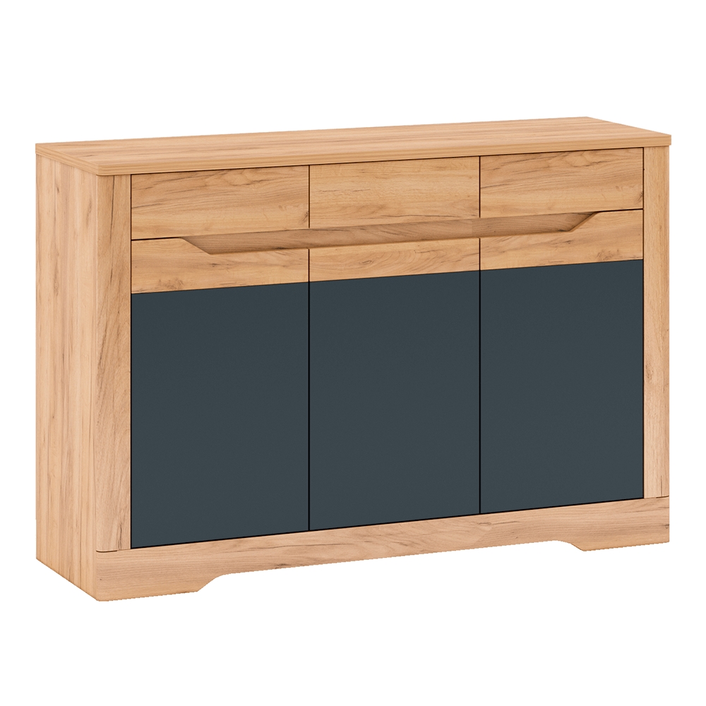 Trojdverová komoda so zásuvkami FIDEL E je jedným z moderných komponentov sektorového nábytku FIDEL. Rozmery komody sú (ŠxHxV): 135x42x91 cm. Hrúbka materiálu korpusu je 16 mm, hrúbka materiálu vrchnej dosky je 22 mm. Originálny dizajn komody si zamilujete a poteší Vás aj bohatý úložný priestor…
