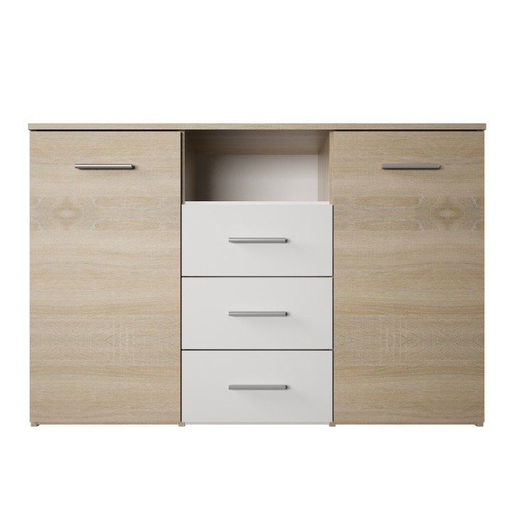 Komoda GABRIELA je dvojdverová komoda s tromi zásuvkami a otvorenou poličkou uprostred. Komoda predstavuje kvalitný slovenský výrobok vyrobený z laminovanej DTD vo farebnom prevedení dub sonoma / biela. Komoda má rozmery 120x38x80 cm, zásuvky 40×19 cm a dvierka 39,5×76,5 cm.
