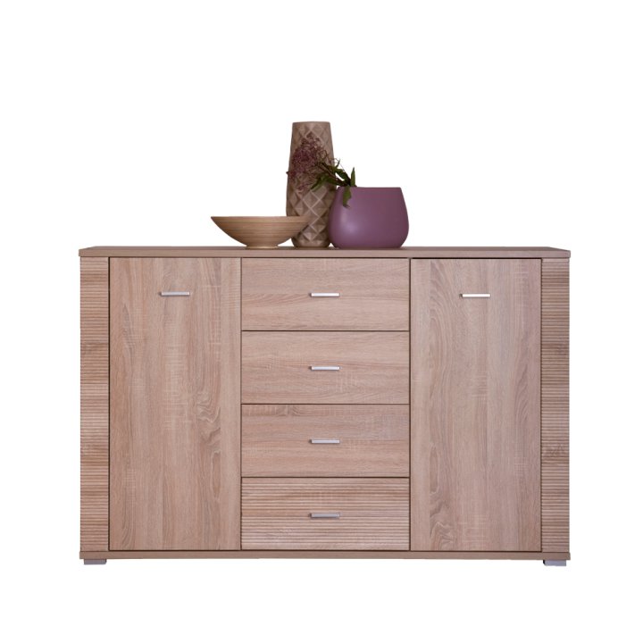 Komoda GRAND 9 je dvojdverová komoda so štyrmi zásuvkami uprostred, ktorú možno kombinovať s ostatnými prvkami z modelovej rady Grand. Systém Grand je sektorová zostava vyrobená z kvalitnej laminovanej DTD vo farebnom prevedení dub sonoma. Zostavu je vhodné umiestniť do svetlých a väčších…