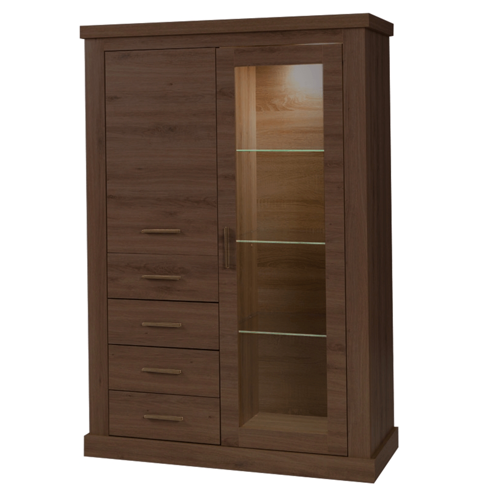 Vitrína HILARD AR3 Vám uľahčí život a nastolí v miestnosti štýl a poriadok. Jej rozmery sú (ŠxHxV): 113x44x165 cm. Vitrína poskytuje úložný priestor v podobe štyroch zásuviek, skrinky a políc ukrytých za dvierkami so sklom. Kovové úchytky a farebné prevedenie dub stirling elegantne dopĺňajú jej…