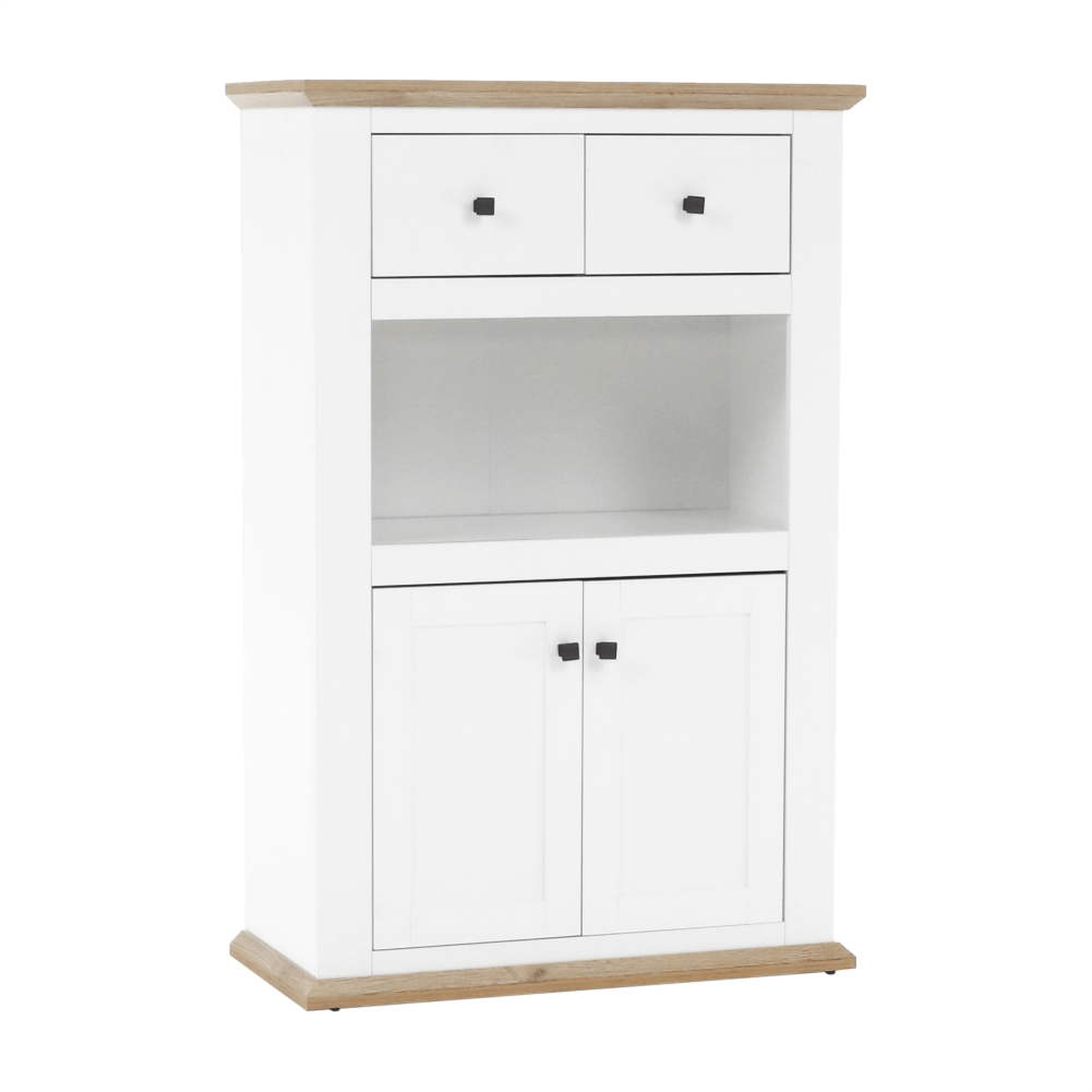 Na modernej vlne prichádza dvojdverová komoda so zásuvkami LEON MZ8. Jej rozmery sú (ŠxHxV): 85x40x130 cm. Zdobia ju skromné, ale elegantné kovové úchytky. Disponuje úložným priestorom v podobe dvoch zásuviek, dvojdverovej skrinky a otvoreného úložného priestoru. Provensálsky sektorový nábytok LEON…