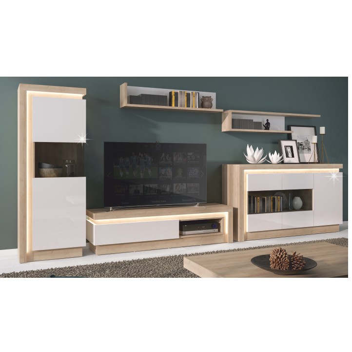KONDELA Leonardo obývacia stena dub riviera / biely vysoký lesk