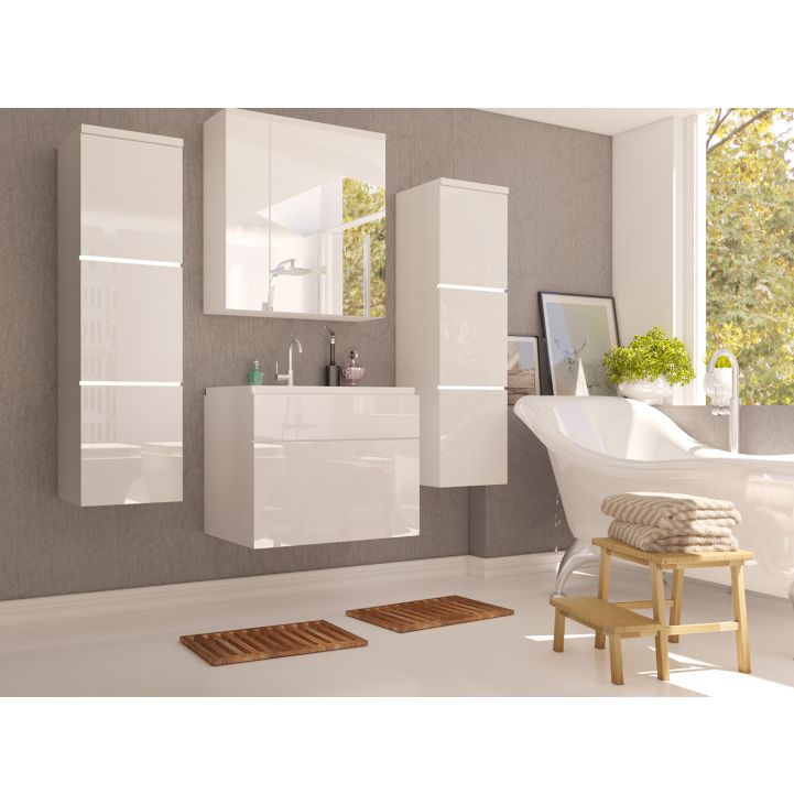 Kúpeľňu MASON možno zakúpiť ako zostavu, ktorá pozostáva z: 2x vysoká skrinka (30x31x110 cm), skrinka so zrkadlom (60x17x65 cm), skrinka pod umývadlo (60x47x45 cm) a dolomitové umývadlo (61x45x14 cm). Zostava je vyrobená z kombinácie laminovanej DTD a MDF vo farebnom prevedení biela / biely vysoký…