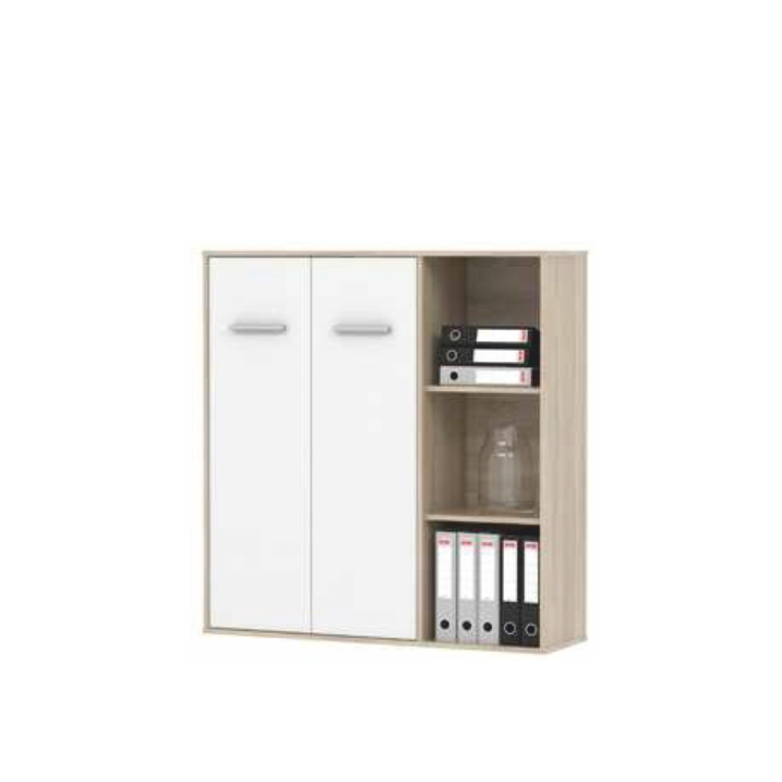 Skrinka s regálom MAURUS MA32 NEW je dvojdverová skrinka s policovou časťou, ktorá výborne zapadne do Vašej kancelárie. Skrinku možno kombinovať s ostatnými prvkami z modelovej rady Maurus. Je vyrobená z laminovanej DTD s hrúbkou 16 mm vo farebnom prevedení dub sonoma / biela.