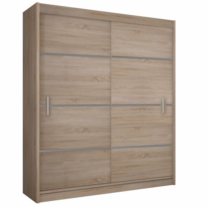 Skriňa MERINA 150 je dvojdverová šatníková skriňa s posuvnými dverami. Za ľavými dverami sa nachádzajú 3 police a za pravými dverami vešiaková tyč. V hornej časti skrine sa nachádza polica. Materiál použitý na výrobu je laminovaná DTD a lišty sú z fóliovanej MDF vo farebnom prevedení dub…