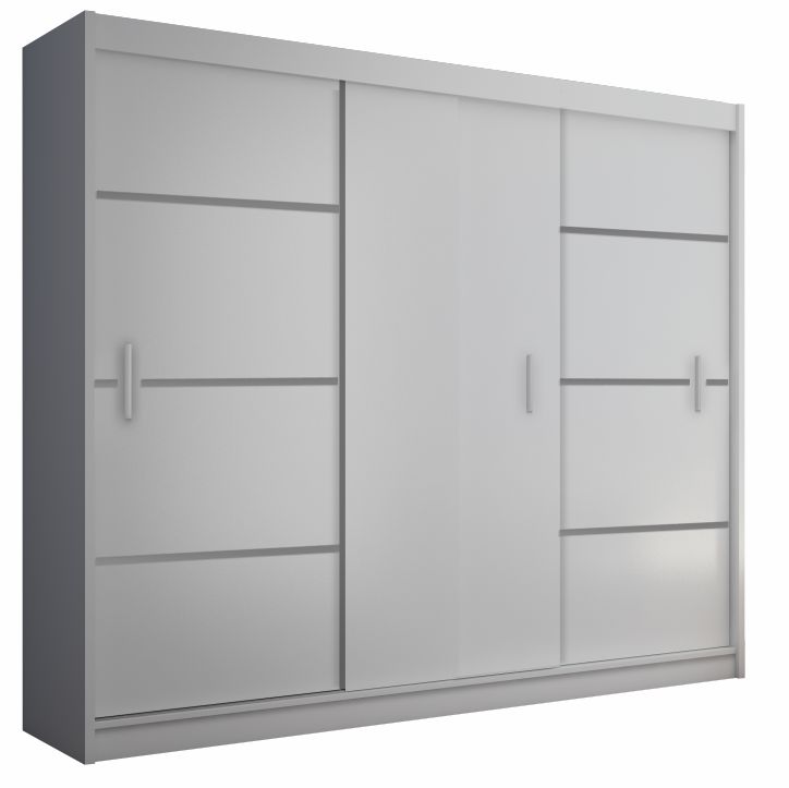 Skriňa MERINA 250 je trojdverová šatníková skriňa s posuvnými dverami. Za ľavými a pravými dverami sa nachádzajú 3 police, za strednými dverami vešiaková tyč a 2 zásuvky. V hornej časti skrine sa nachádza polica rozdelená priečkou na 2 časti. Materiál použitý na výrobu je laminovaná DTD a lišty…