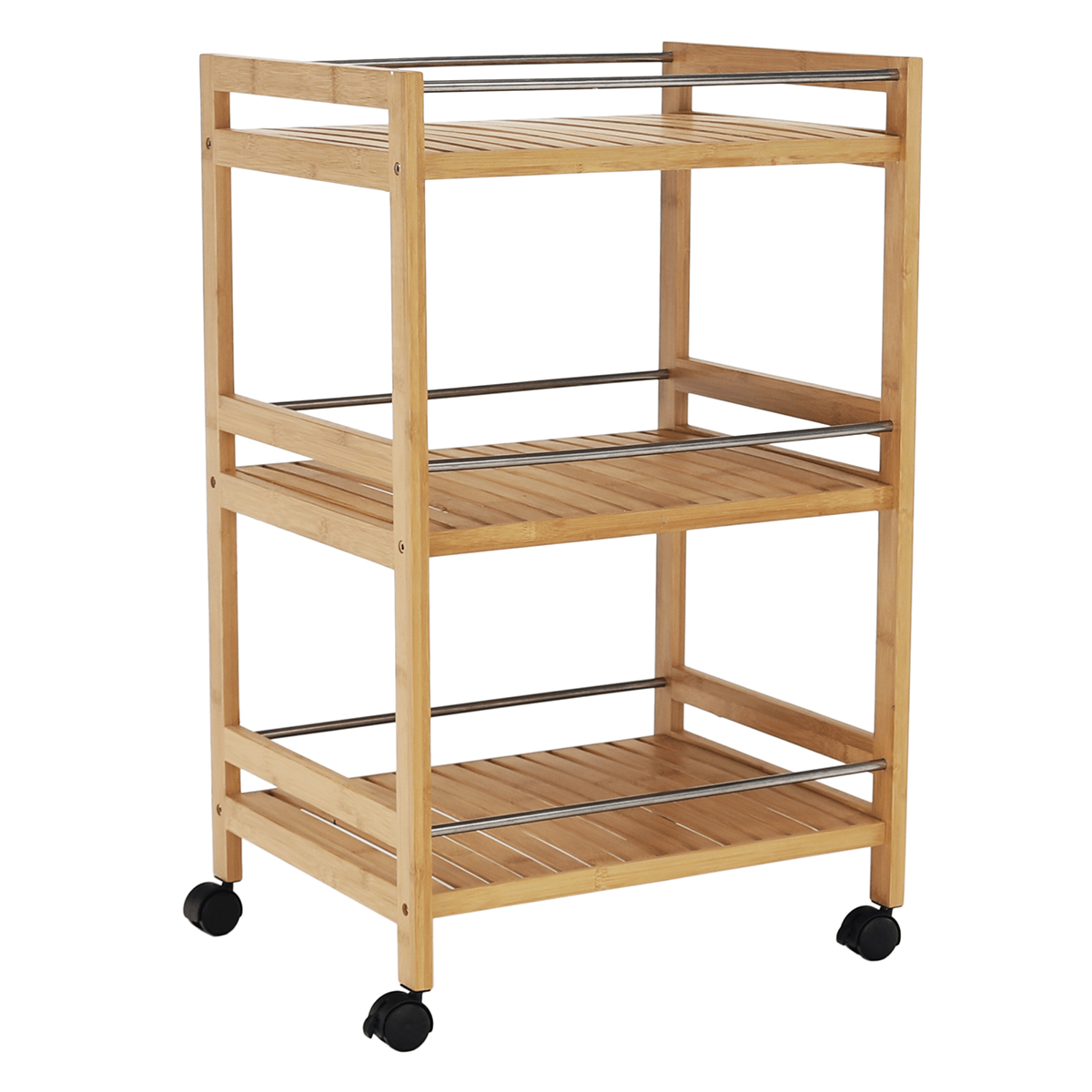 Servírovací stolík na kolieskach NASHY je vyrobený z bambusu v prírodnej farbe s nehrdzavejúcimi oceľovými tyčami. Jeho rozmery sú (ŠxHxV): 47x38x76 cm. Regál stojí na kolieskach (2 kolieska s brzdami), vďaka ktorým je ľahko ovládateľný. Stolík obsahuje 3 police. Tovar je dodávaný v demonte.