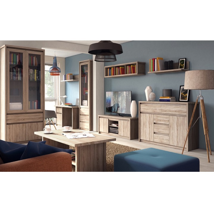 Obývaciu izbu NORTY možno zakúpiť ako zostavu, ktorá pozostáva z: široká vitrína (88x40x210 cm), PC stôl (120x60x75 cm), konferenčný stolík (120x60x50,5 cm), úzka vitrína (57x40x210 cm), TV stolík (127x42x51 cm), komoda (168x40x92 cm), 2x jednoduchá polica (87x22x20 cm) a trojdielna polica …