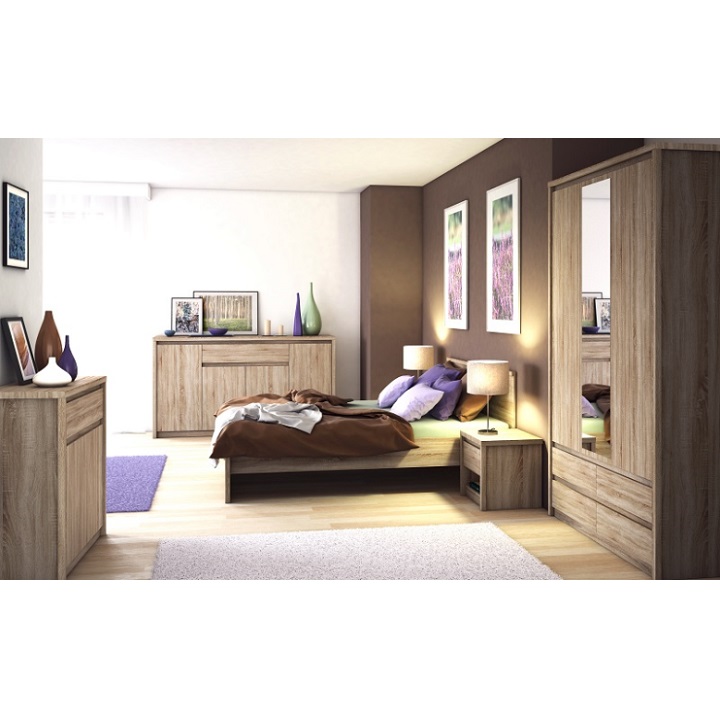Spálňu NORTY možno zakúpiť ako zostavu, ktorá pozostáva z: komoda (87x40x92 cm), široká komoda (168x40x92 cm), manželská posteľ (165,5x205x85 cm), 2x nočný stolík (46,5x42x45 cm) a šatníková skriňa (127x60x210 cm). Posteľ sa dodáva bez roštu a matraca, ktoré je možné doobjednať. Spacia plocha má…