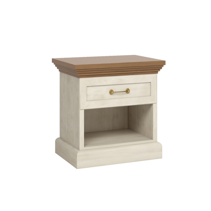 Nočný stolík ROYAL SN možno kombinovať s ostatnými prvkami z modelovej rady Royal. Obsahuje zásuvku a otvorený priestor na odkladanie vecí, ktoré chcete mať vždy poruke. Systém Royal je elegantná sektorová zostava vyrobená v anglickom štýle, ktorú si môžete vyskladať podľa Vašich potrieb a predstáv…