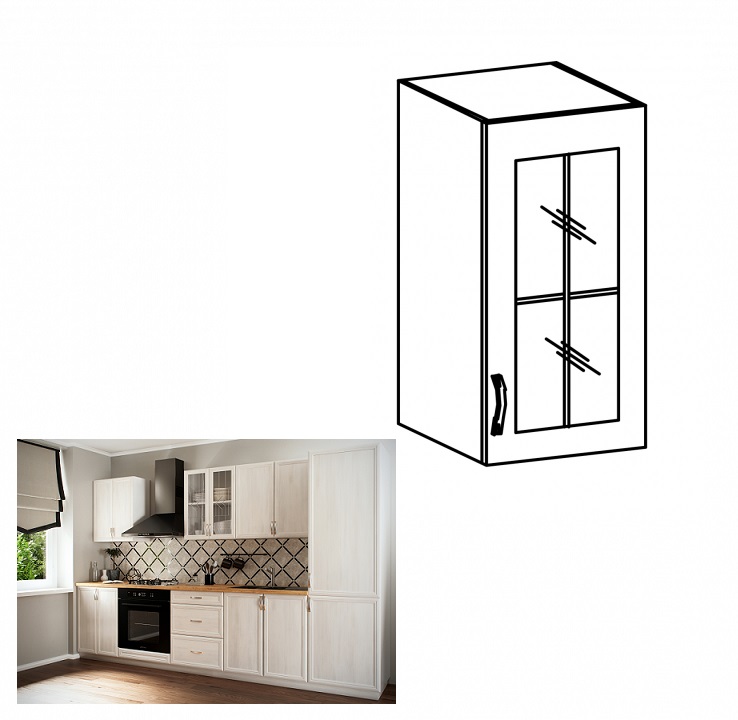 Rustikálna horná kuchynská skrinka SICILIA G40S P je jednodverová skrinka so sklom, ktorá je vnútri rozdelená policou na 2 odkladacie priestory. Sklo je priezračné, zdobené jemným ornamentom. Dvierka sa otvárajú pomocou plastovej úchytky. Pravé prevedenie umožňuje otváranie dvierok do pravej strany…