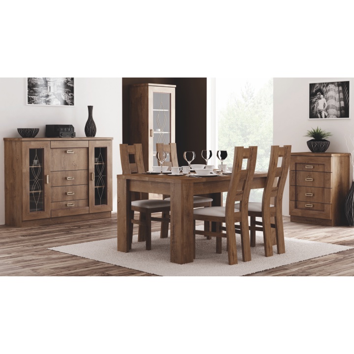 Jedáleň TEDY možno zakúpiť ako zostavu, ktorá pozostáva z: barová skrinka (140x44x110 cm), vitrína (46x44x190 cm) a komoda (63x44x90 cm). Systém Tedy je rustikálna sektorová zostava, ktorú je vhodné umiestniť do obývacej izby, spálne alebo kancelárie. Zostava je vyrobená z laminovanej DTD…