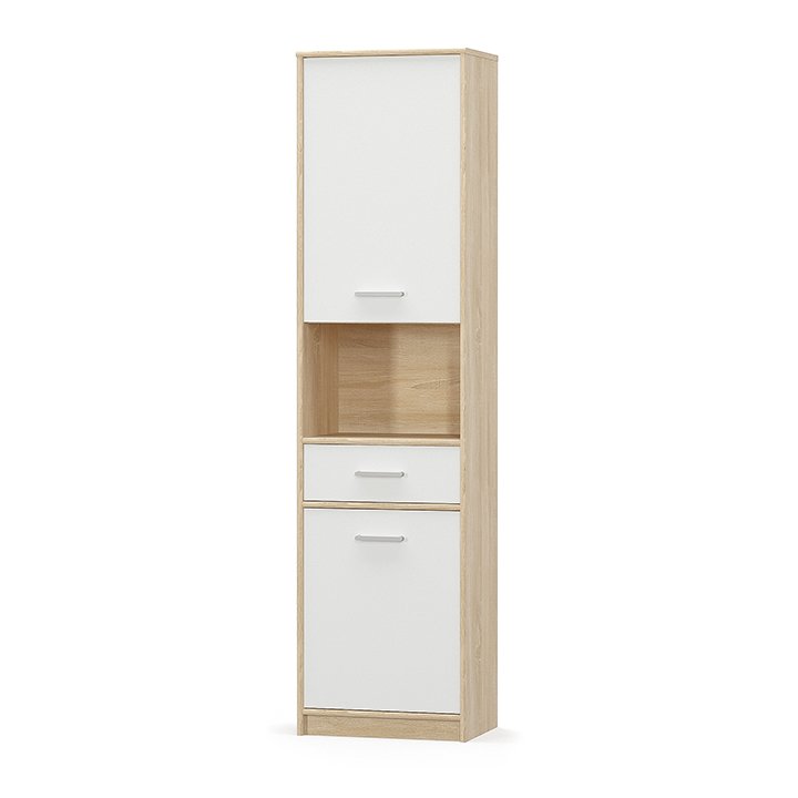 S regálom TEYO 2D1S nádherne oživíte a zariadite izby Vašich ratolestí. Rozmery regálu sú (ŠxHxV): 50x34x195 cm. Je vyrobený z kvalitnej laminovanej DTD (drevotriesková doska). Jemná farebná kombinácia dubu sonoma s bielou dodáva nábytku nadčasovosť. Regál poskytuje dostatok úložného priestoru…